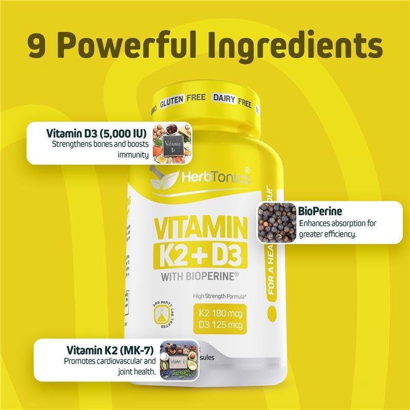 Herbtonics Vitamin K2+D3 acts as an all-natural dietary supplement with a potent formula of 180 mcg of K2 and 125 mcg of D3, combined with BioPerine and is the perfect combination for those looking to enhance joint mobility and overall wellness!