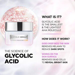 Glycolic Bright Glowing Cream Day with brightening Glycolic Acid helps brighten and reduce dark spots for even glowing skin.