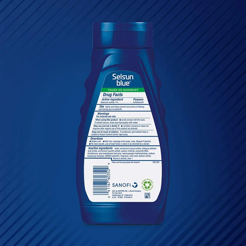 Selsun Blue Moisturizing with Aloe Dandruff Shampoo – 325ml great for hair. Targets the source to control dandruff. Conditions and moisturizes your hair. Chattem: A Sanofi Company. Please recycle. Uses: For relief for flaking and itching due to dandruff and seborrheic dermatitis, and to help prevent their recurrence. Directions: For best results, use at least twice a week or as directed by a doctor. Shake well. Shampoo, then rinse thoroughly. Warnings: For external use only. Ask a doctor before use if you have: seborrheic dermatitis in areas other than the scalp. When using this product: avoid contact with eyes. If contact occurs, rinse eyes thoroughly with water; for color-treated or permed hair, rinse thoroughly. Stop use and ask a doctor if: the condition worsens or does not improve after regular use of this product as directed. Keep out of reach of children.